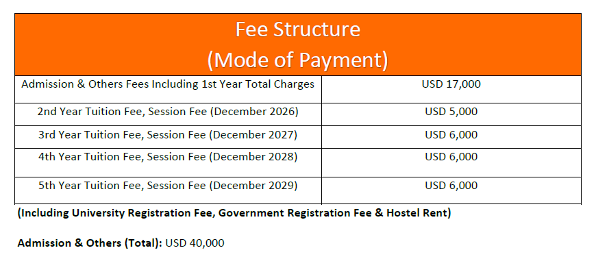 • Admission Confirmation: USD 12,000.00 (This Amount will be adjusted from Admission & Others fees)